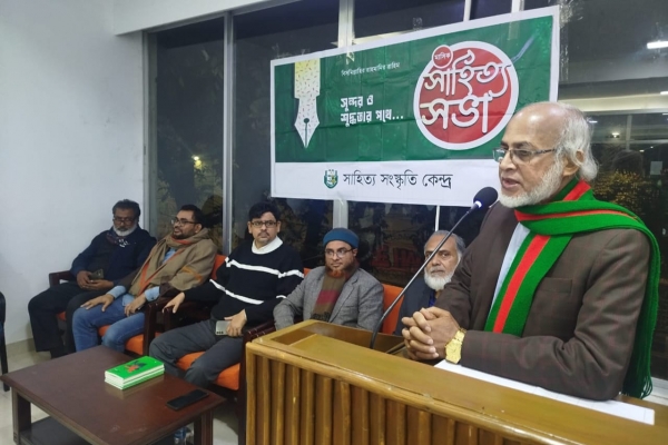সাহিত্য সংস্কৃতি কেন্দ্রের সাহিত্য বিভাগের আয়োজনে নিয়মিত সাহিত্য সভা গত শনিবার (২৭ ডিসেম্বর) বিকেলে বাংলা একাডেমির কবি আল মাহমুদ কর্ণার সভাকক্ষে অনুষ্ঠিত হয়। সাহিত্য বিভাগের পরিচালক আব্দুর রহমানের সভাপতিত্বে অনুষ্ঠিত সভায় প্রধান অতিথির বক্তব্য রাখেন প্রাবন্ধিক, কবি, মিডিয়া ব্যক্তিত্ব ও ইতিহাস গবেষক আশরাফুল ইসলাম, প্রধান বক্তা ছিলেন সাহিত্য সংস্কৃতি কেন্দ্রের সভাপতি মাহবুব মুকুল। বিশেষ অতিথির বক্তব্য রাখেন সাহিত্য সংস্কৃতি কেন্দ্রের সেক্রেটারি আল্লামা ইকবাল। অন্যান্য অতিথির মধ্যে ছিলেন নাবিক সাহিত্য সংস্কৃতি সংসদ সভাপতি কবি সালেহ মাহমুদ, কবি কাজী নজরুল ইসলাম সংসদ সভাপতি প্রফেসর মঈন উদ্দিন। কবি আবুল খায়ের নাইমুদ্দীন ও সরদার আব্বাস উদ্দিনের সঞ্চালনায় অনুষ্ঠিত সাহিত্য সভায় লেখা পাঠ করেন অধ্যাপক কবি আর কে শাব্বির, কবি মুর্শিদ- উল- আলম, কবি জাফর পাঠান, কবি তাজ ইসলাম, কবি জালাল খান ইউসুফী, কবি রাইহান নাসরিন, কথাসাহিত্যিক শাহানারা স্বপ্না, কবি সুমন রায়হান, কবি কবির ভূঁইয়া, কবি মুরাদ আল হাসান চৌধূরী, কবি খন্দকার নূর হোসাইন, কবি নওশাদ আলম, কবি জুবায়ের বিন ইয়াসিন, কবি আবু জাফস সালেহী, কবি সাকিল সরকার। উপস্থিত ছিলেন সদরঘাট ম্যাগাজিন সম্পাদক শফিকুল ইসলাম। সঙ্গীত পরিবেশন করেন জনপ্রিয় কিশোর শিল্পী জাহিন ইকবাল।