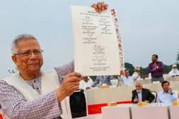গণতন্ত্র পুনঃপ্রতিষ্ঠা, মানবাধিকার রক্ষা এবং রাষ্ট্রীয় সংস্কারের প্রতিশ্রুতি দিয়ে ঐতিহাসিক জুলাই জাতীয় সনদ ২০২৫ স্বাক্ষর করেছেন প্রধান উপদেষ্টা ড. মুহাম্মদ ইউনূস ও দেশের প্রধান প্রধান রাজনৈতিক দলের নেতারা।শুক্রবার (১৭ অক্টোবর) বিকেল ৫টায় জাতীয় সংসদ ভবনের দক্ষিণ প্লাজায় জুলাই জাতীয় সনদ ২০২৫ -এ স্বাক্ষর করেন তারা।গত বছরের আগস্টে অন্তর্বর্তী সরকার দায়িত্ব নেওয়ার পর রাষ্ট্রের বিভিন্ন ক্ষেত্রে সংস্কারের উদ্যোগ নেওয়া হয়। প্রথম ধাপে গঠন করা ৬টি সংস্কার কমিশনের (সংবিধান, নির্বাচনব্যবস্থা, জনপ্রশাসন, দুর্নীতি দমন কমিশন, পুলিশ ও বিচার বিভাগ সংস্কার কমিশন) সংস্কার প্রস্তাবগুলো নিয়ে দলগুলোর সঙ্গে কয়েক দফা আলোচনা করে জাতীয় ঐকমত্য কমিশন। গত ফেব্রুয়ারি থেকে জুলাই পর্যন্ত সময়ে হওয়া এসব আলোচনায় ৮৪টি সংস্কার প্রস্তাবে ঐকমত্য হয় রাজনৈতিক দলগুলো।